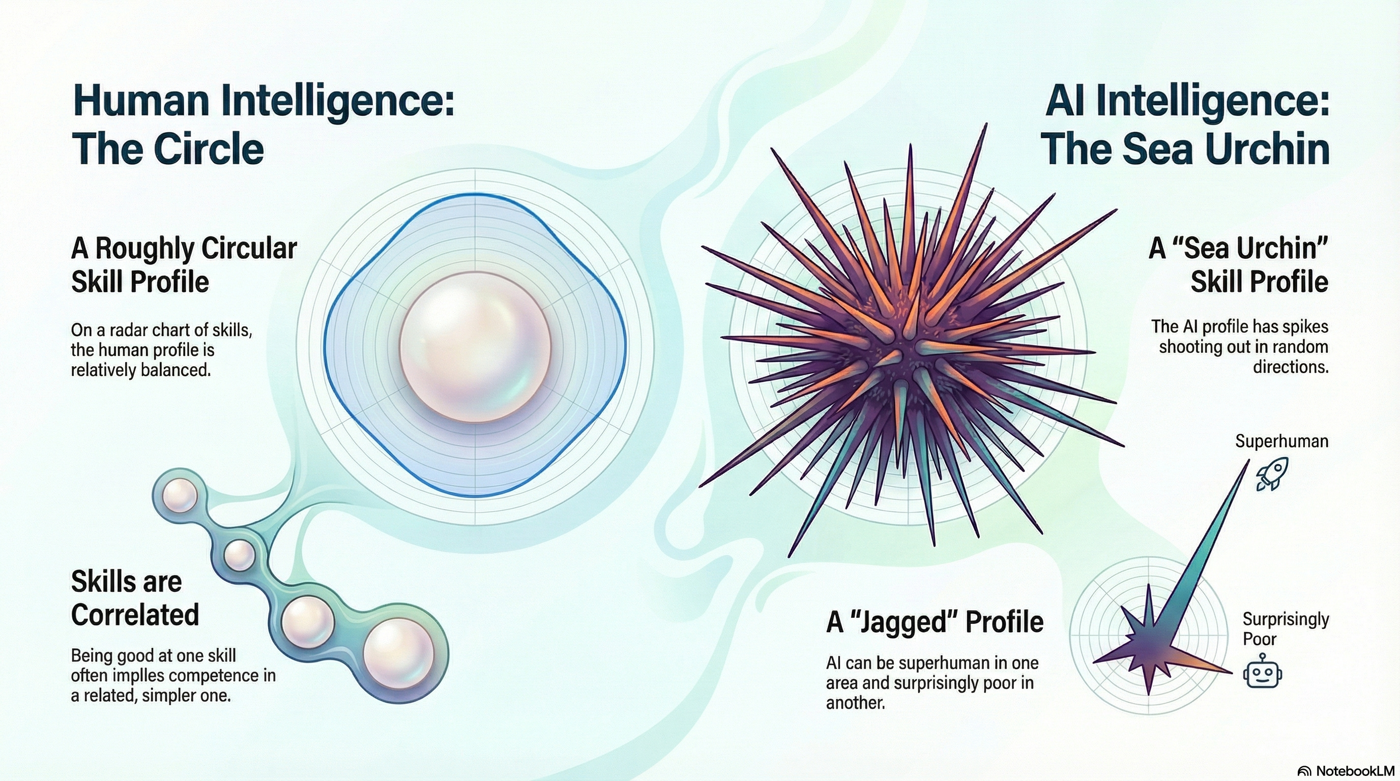 Imagine a radar chart where each spoke represents a different skill. For humans, the shape is roughly circular. Maybe lumpy in places, but correlated. Good at advanced math? Probably fine at basic arithmetic too.